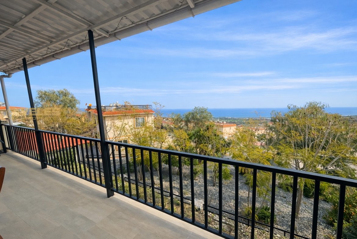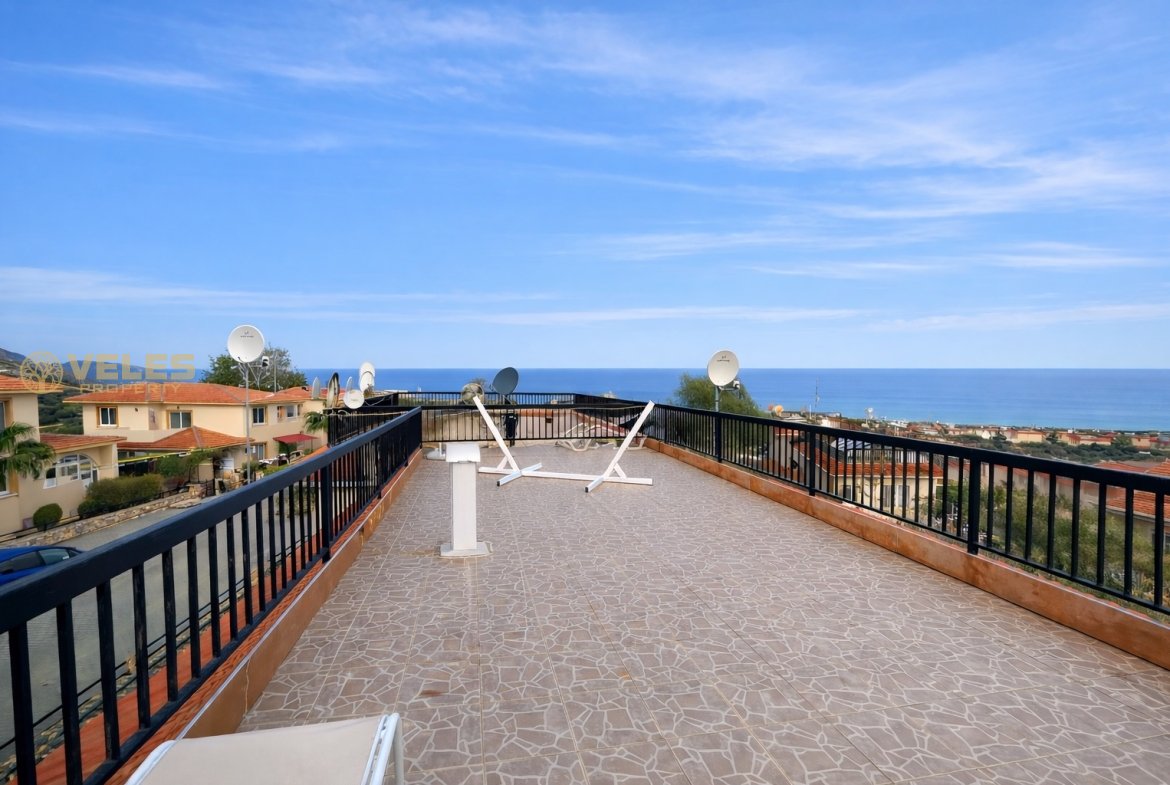 Çatı teraslı sıcak bir daire, bariyerli kapalı bir konut kompleksinde yer almaktadır. Pencereler ve teras, Akdeniz ve dağların manzarasını sunarak, konfor ve huzur dolu bir atmosfer yaratır.